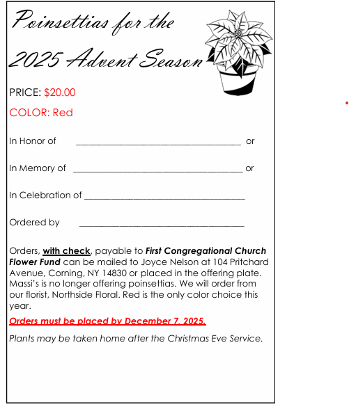 Our Annual Poinsettias Sale for the Advent Season are here. We are offering only a red choice this year as we have had a change in florist. Each Poinsettia is $20.00 and checks can be made out to First Congregational Church Flower Fund.
